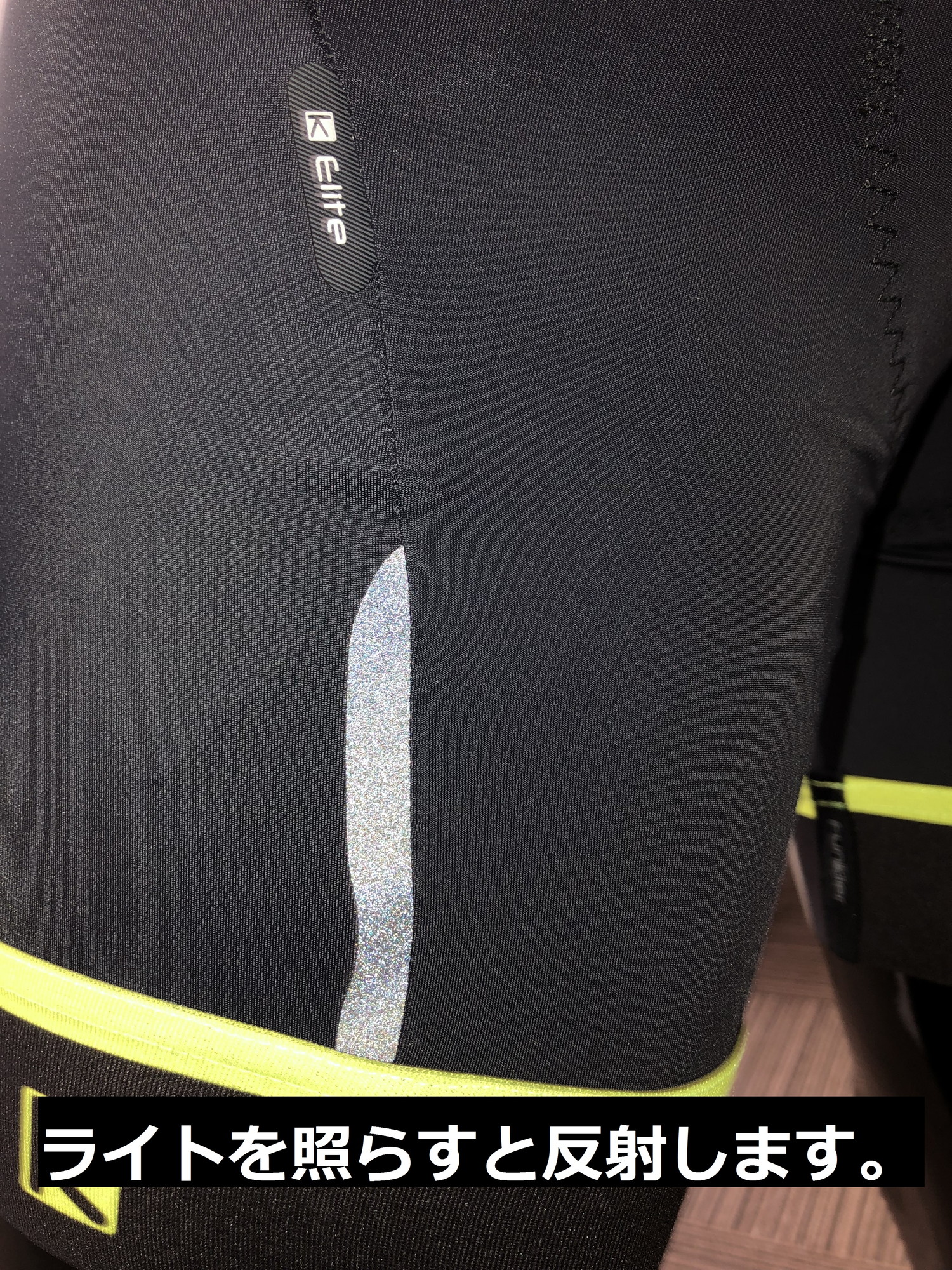 ホールド感の高いグリッパーはレースシーンでもずり上がりを心配せず着用できます。こちらもゲルパッド入りなので、お尻への負担も少ないです。ライトが当たると、しっかり光る再帰反射素材付。