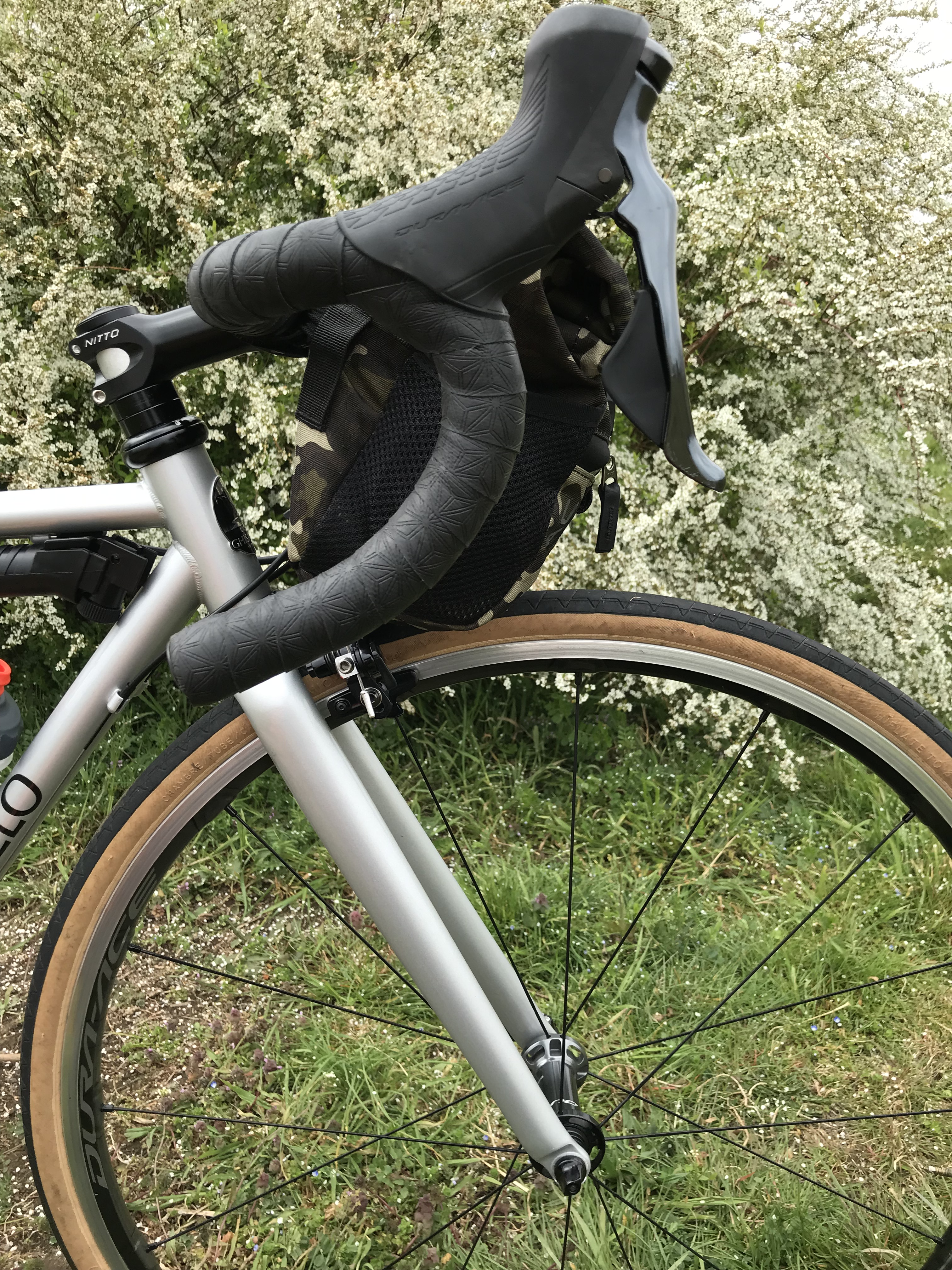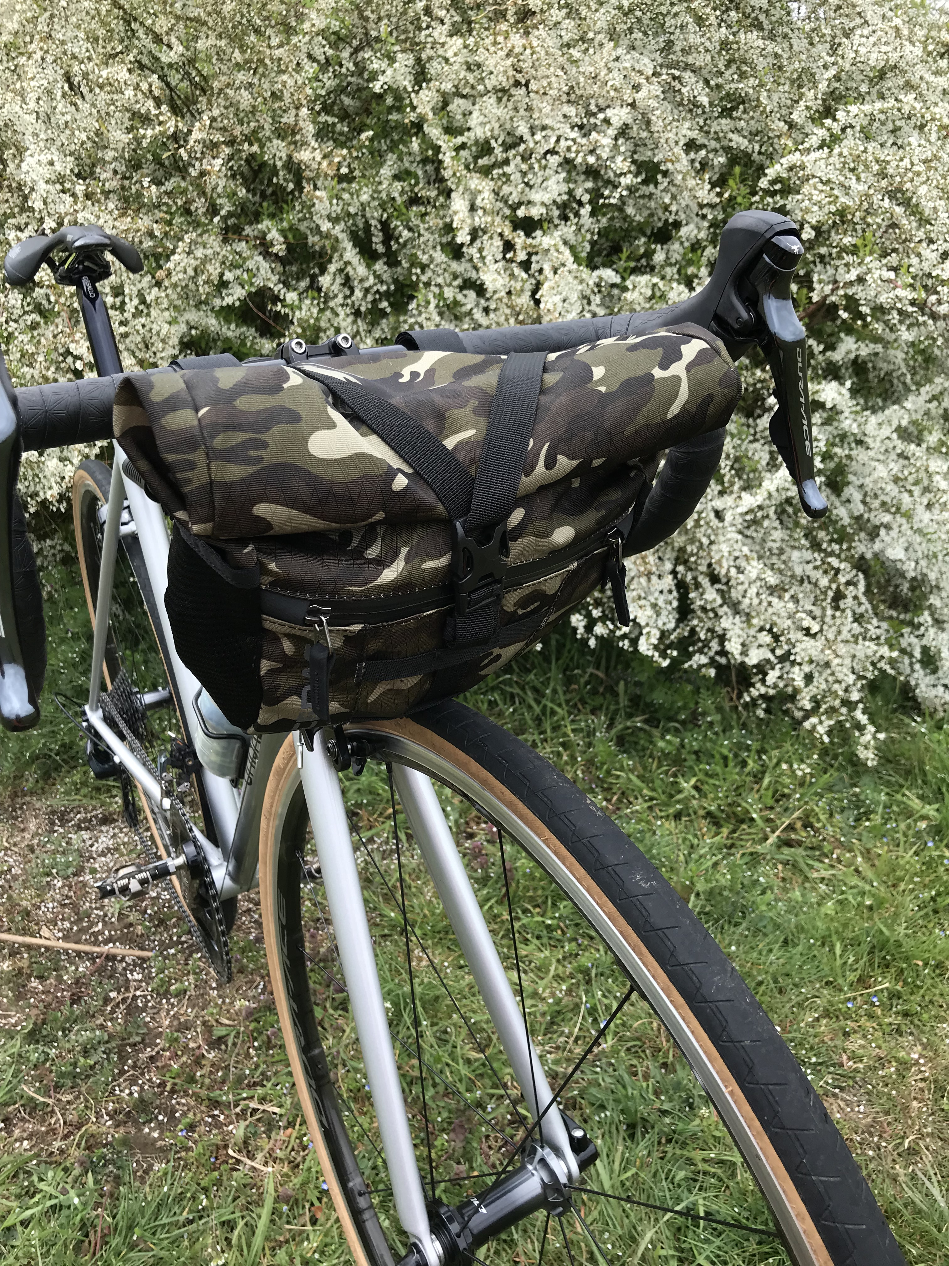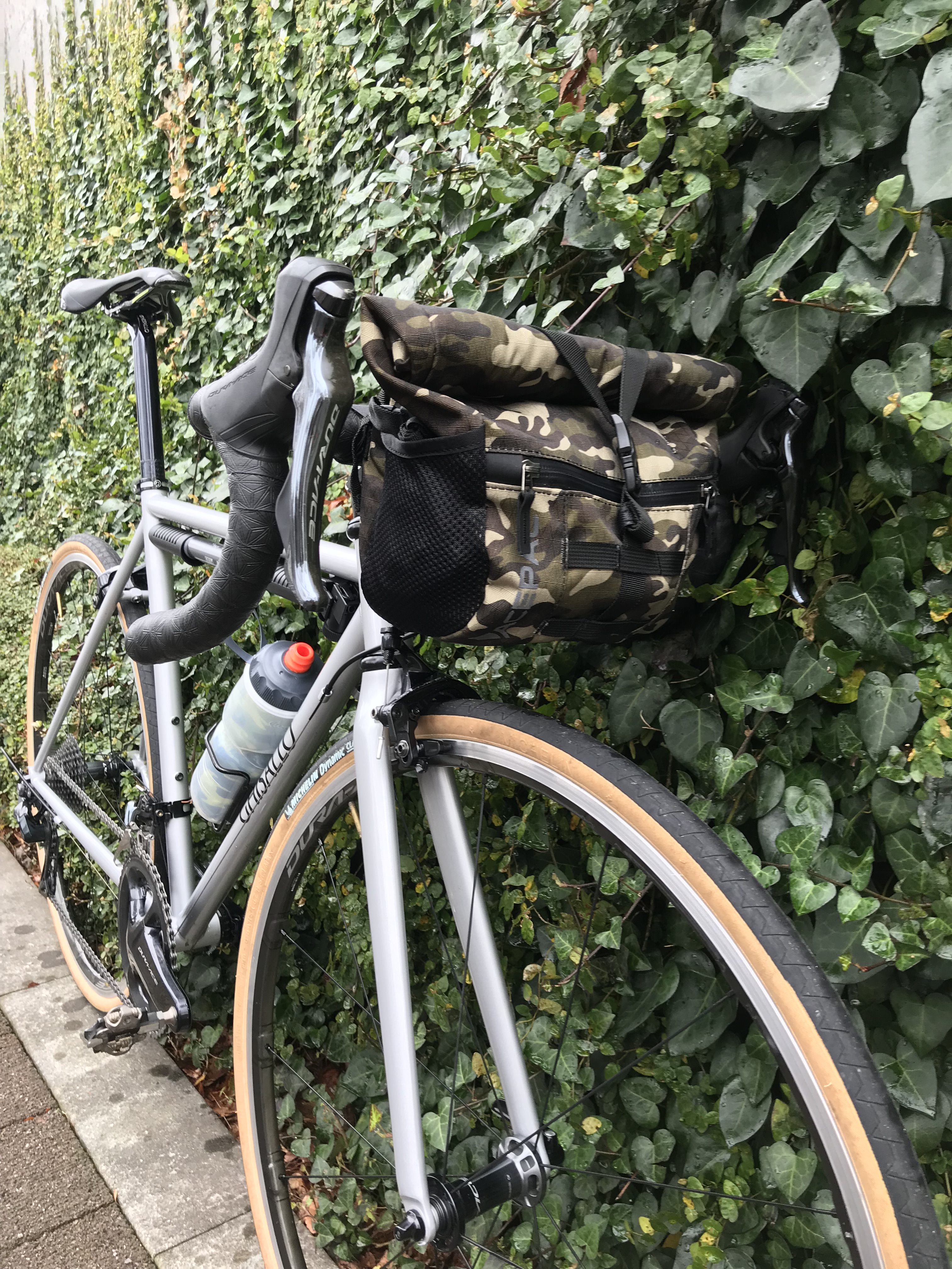 ちなみに取り付ける「フロントバッグ」に関してはハンドルにベルクロなどを巻き付けて取り付ける簡易的なバッグを想定しております。