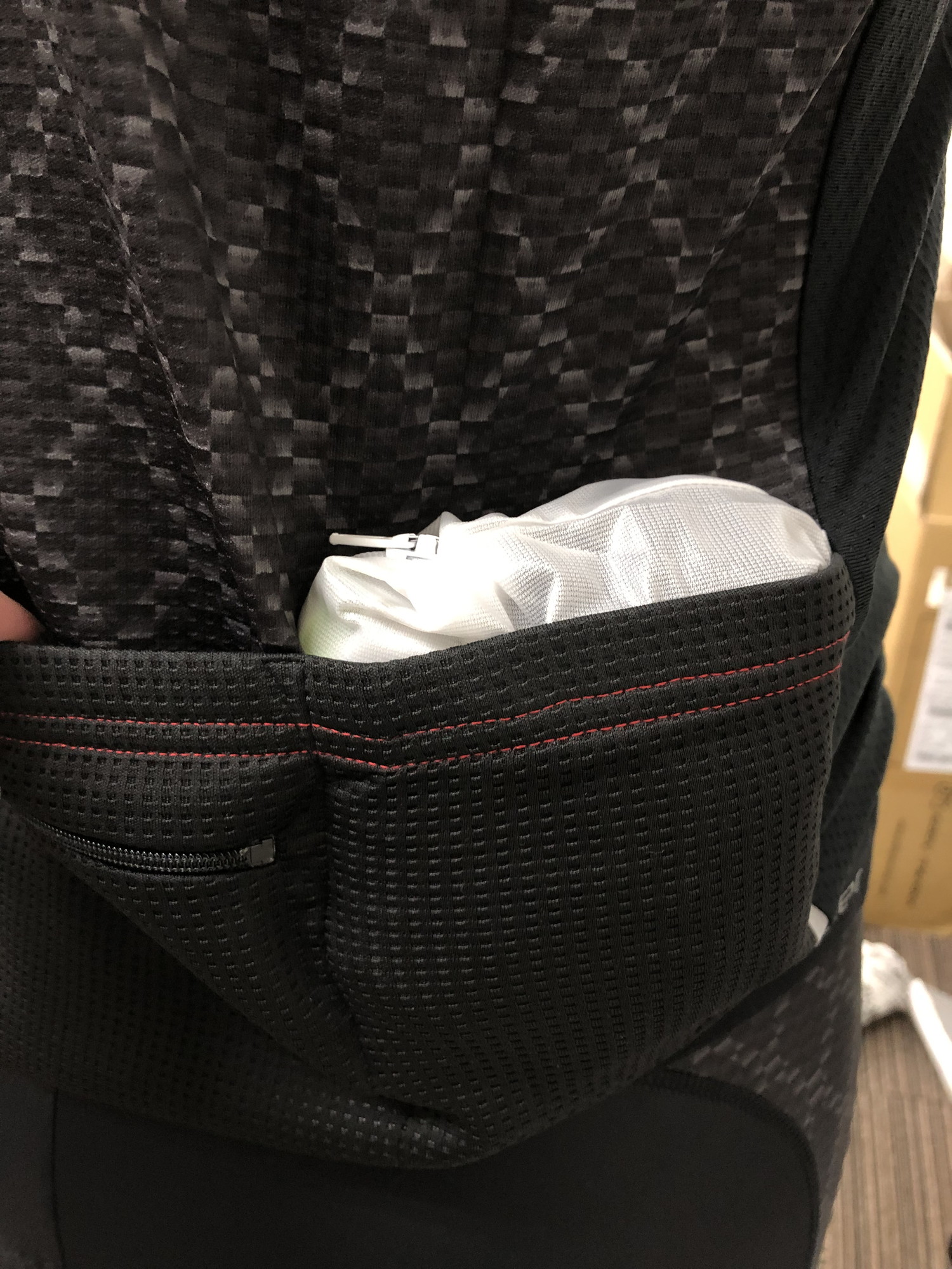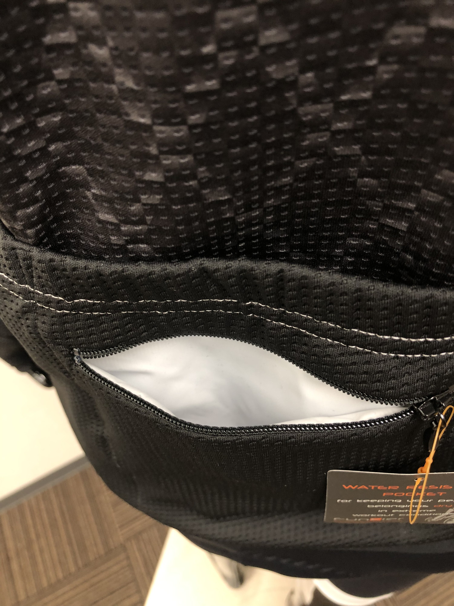 蒸れやすい脇下はメッシュ生地で通気性をUP。バックポケットの中央部には簡易防水加工が施されたジップポケットがあり、貴重品も収容可能です。