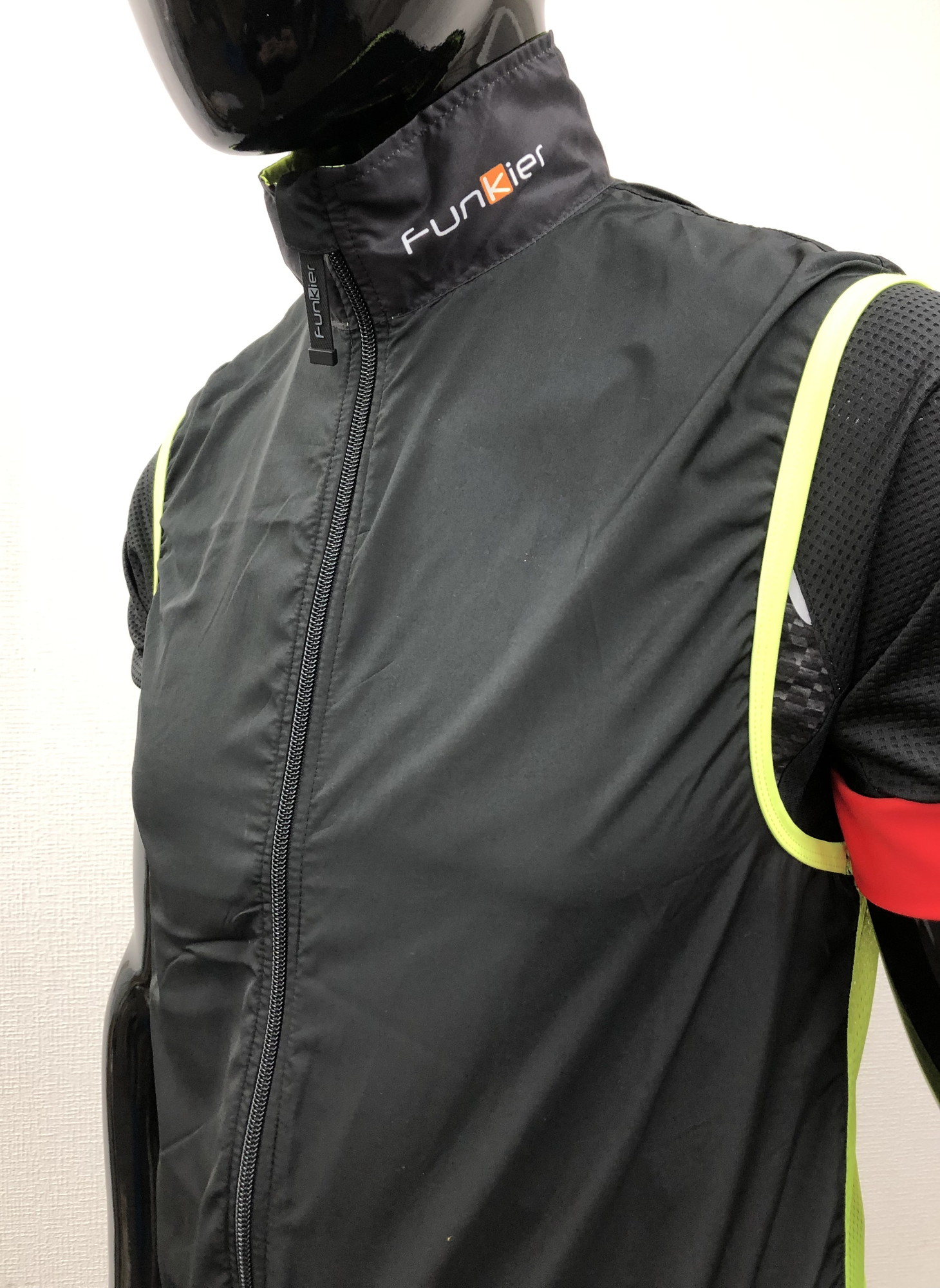 ダブルジッパーを採用したウインドブレークベスト。蛍光色の部分は後方視認性を確保する反射素材を背面上部、下部に採用しています。また、付属のミニナイロン袋へ折りたたむことにより、ジャージのポケットにもすっぽり収まります。