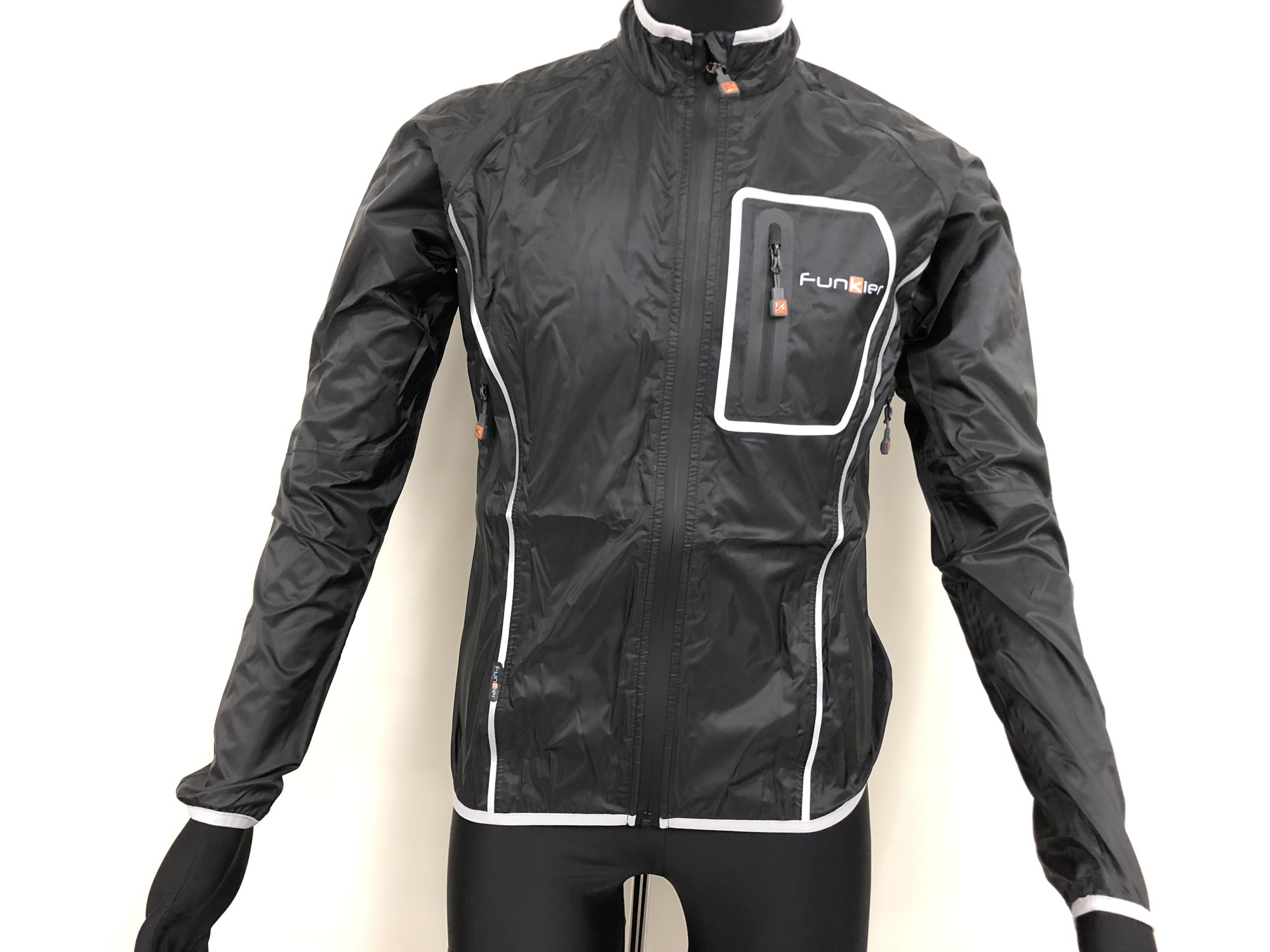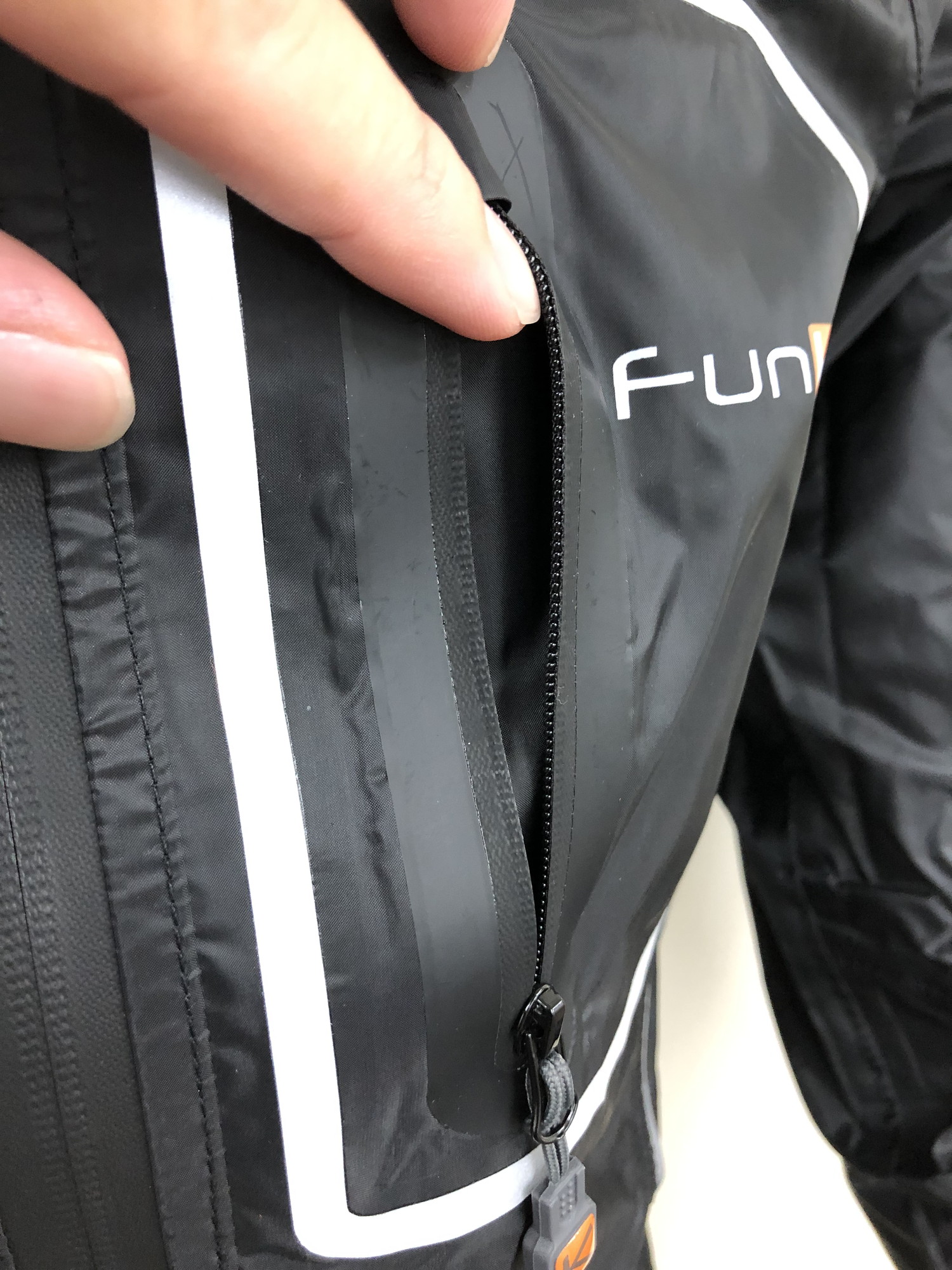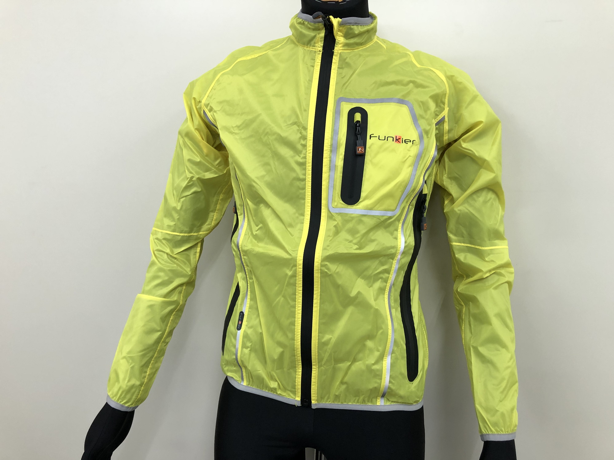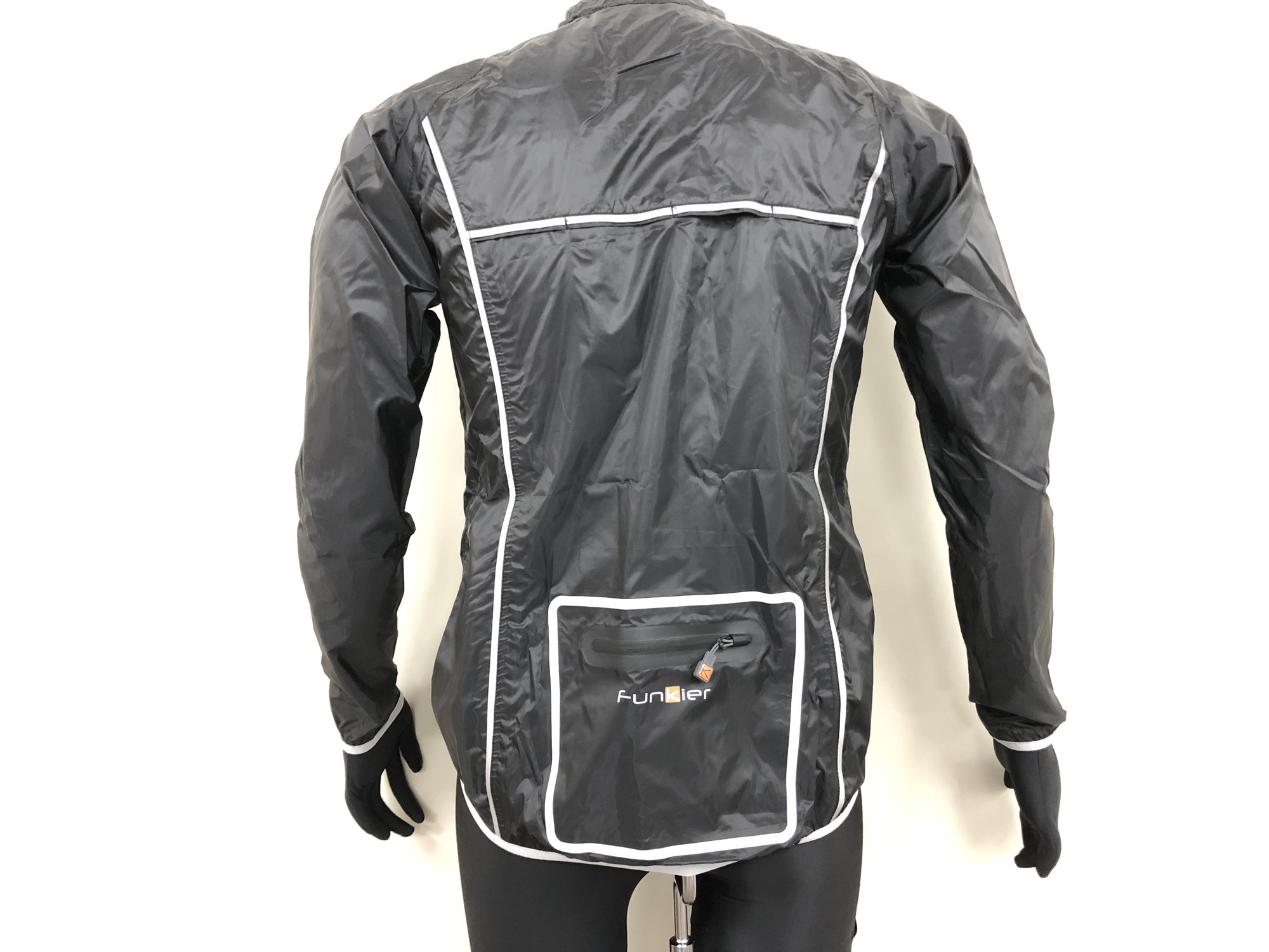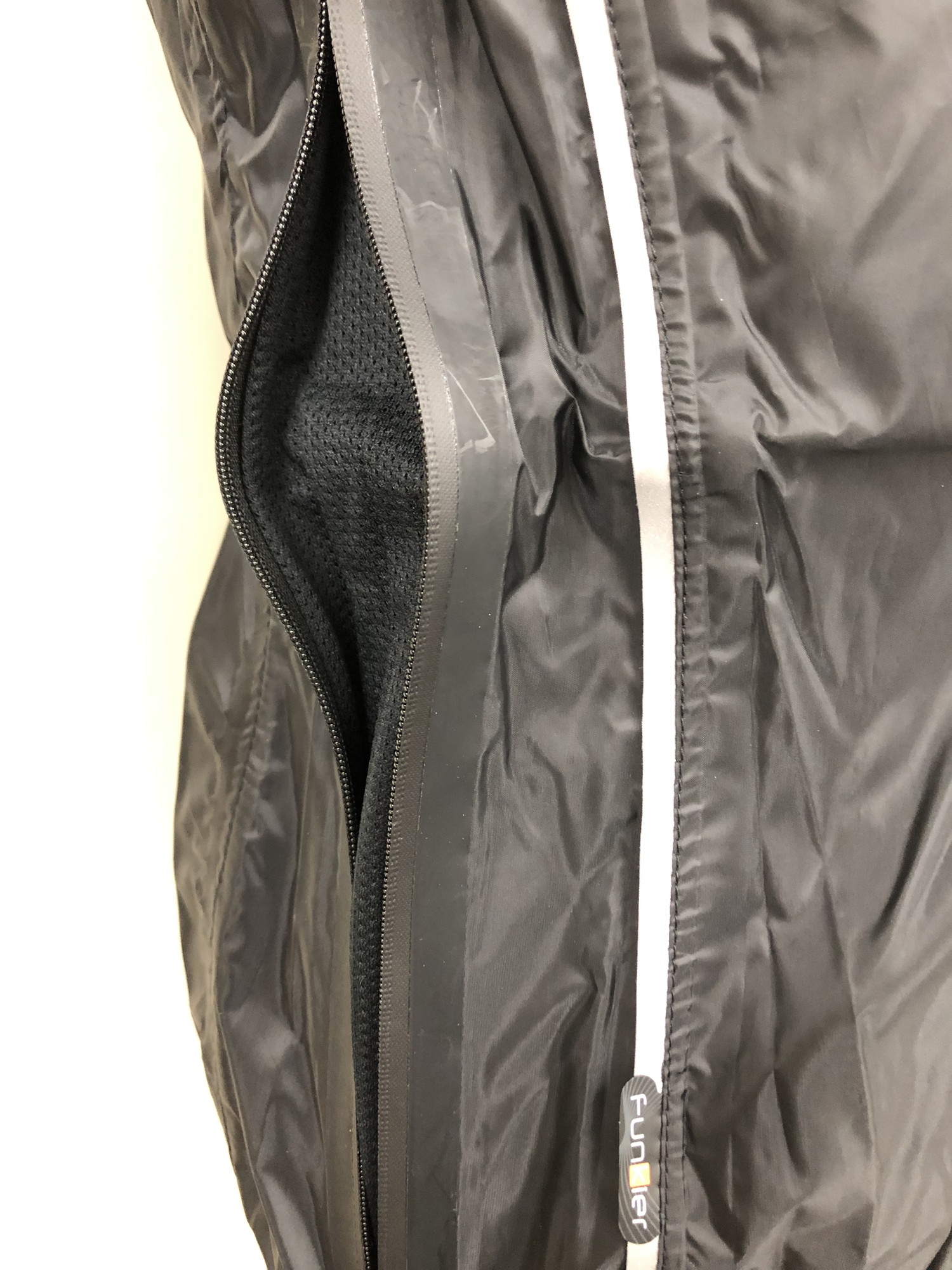 レイン機能に特化したシンプルな作りですが、全てのジップ部は止水仕様、反射素材付、脇下はベンチレーション機能もついています。ポケットが背面と胸についており、鍵などのちょっとしたものを入れるのに便利です。サイズ感に関しては、アジアンサイズですのでお手持ちのウエアをご参考にお選び下さい。