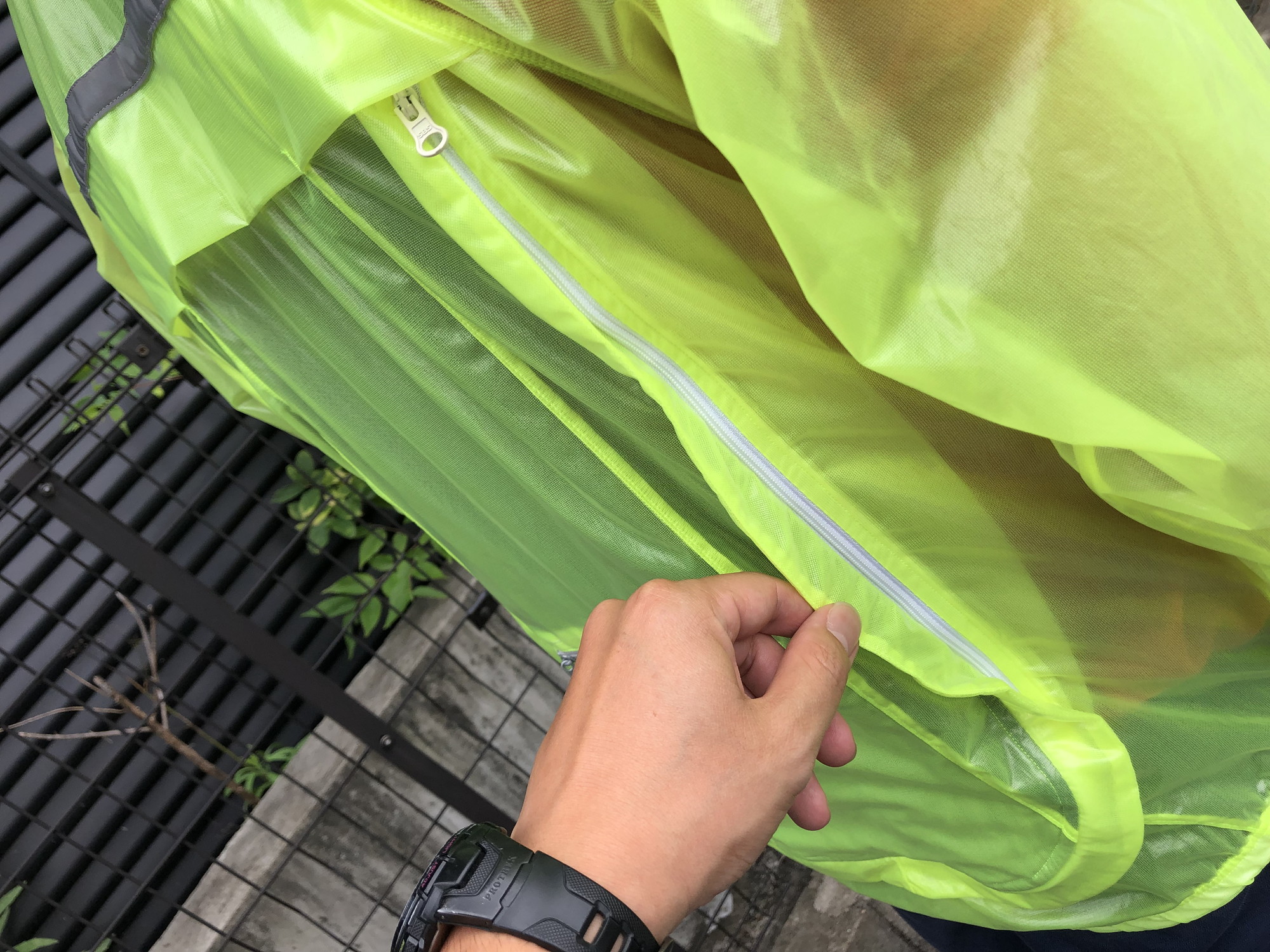 ちなみに、Mサイズ着用の場合だとバッグ無しでちょうどのサイズ感。15L程度のバッグなら問題なしです。バッグを中に入れないときは背面のジッパーを閉じてお使い下さい。