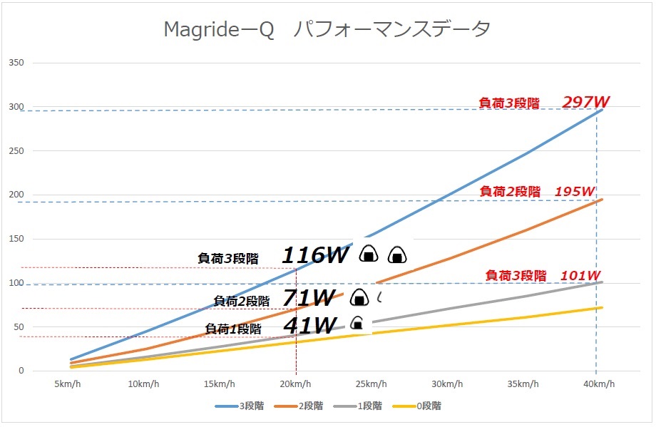 この時速20kmぐらいをミノウラから公開されているMagride-Qのパフォーマンスデータ(ワット)で計算した場合