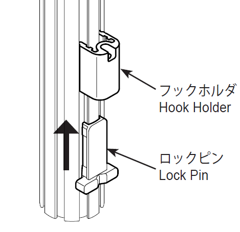 もう少し軽量のものは樹脂製のクリップフックタイプです、フックホルダをスリットに挟み込みロックピンで固定します。こちらもロックピンを外せば自在に取り付けが可能、耐荷重は2kgです。