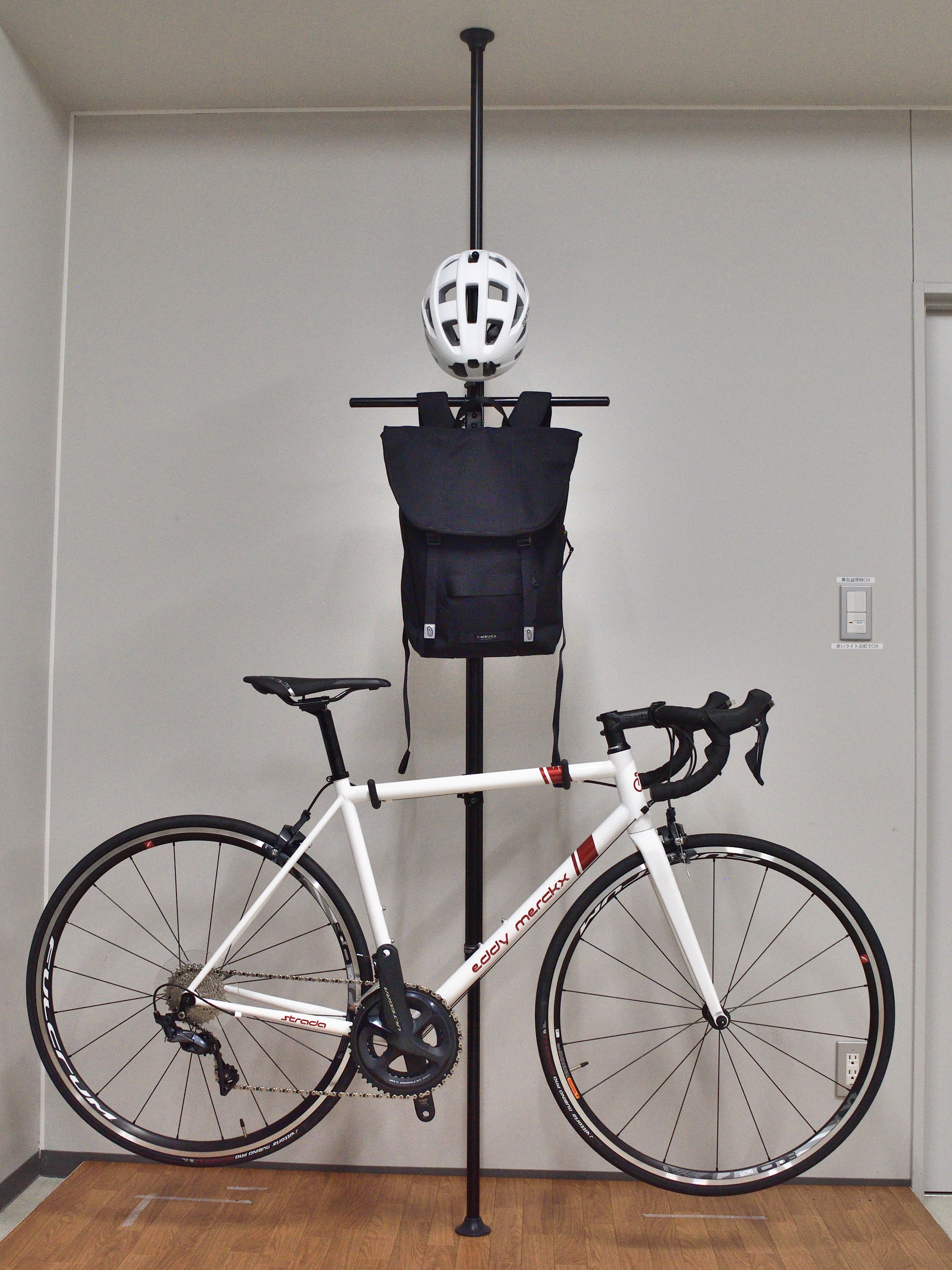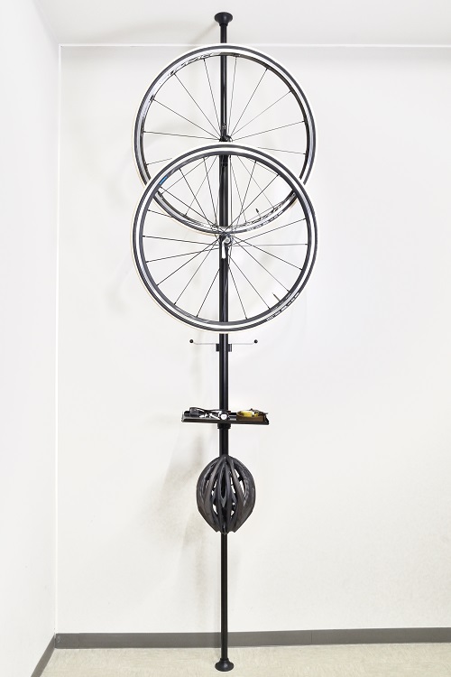 ベース支柱は”突っ張り式”と”自立式”の2種類で突っ張り式は天井高2.1〜2.8mに対応しバイクタワーと同じ構造でスプリングで突っ張りますので横揺れに強く安定します。